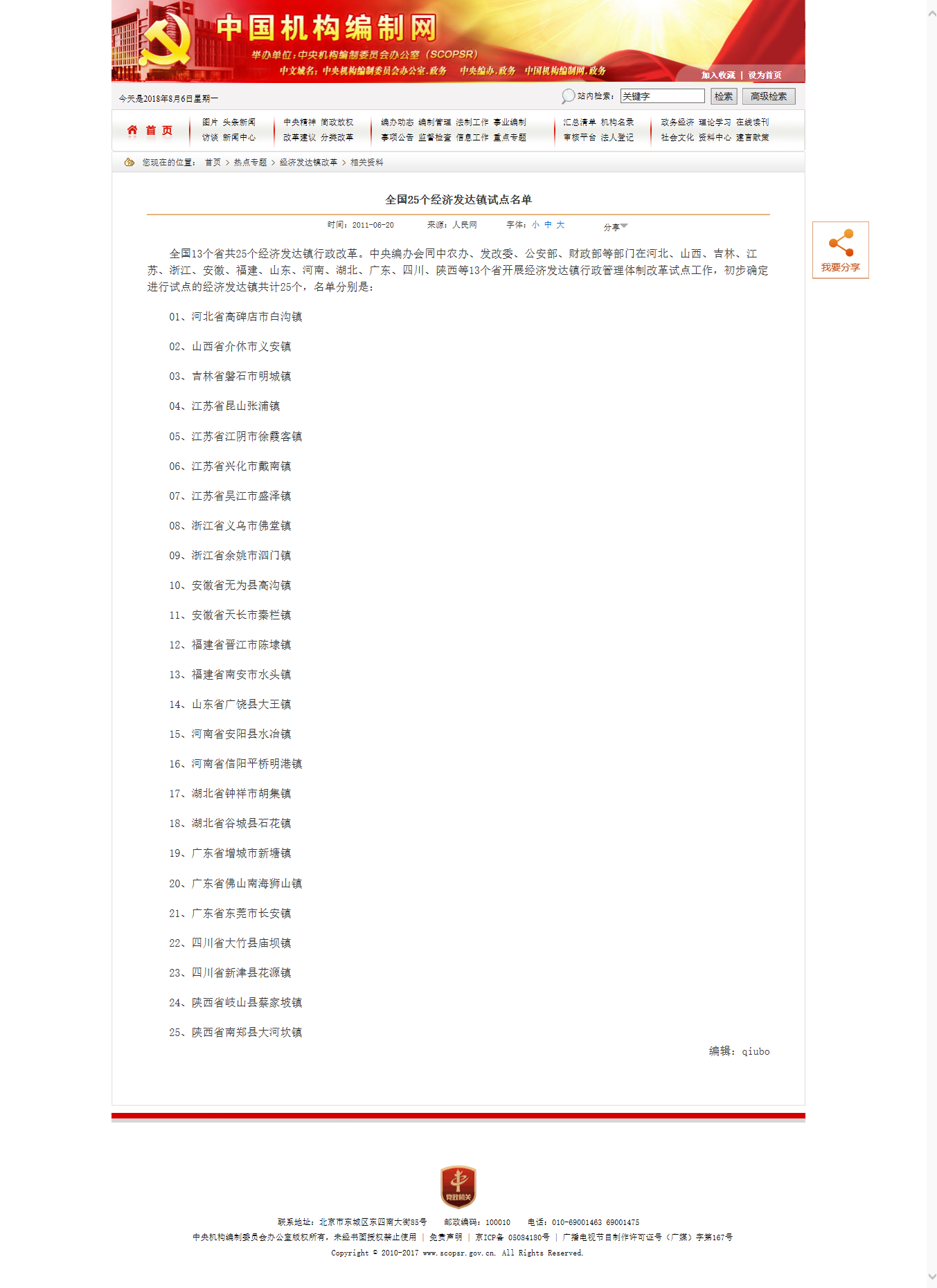 2010年6月,中央編辦會(huì)同中農(nóng)辦、國(guó)家發(fā)改委、公安部、財(cái)政部等部門(mén)在13個(gè)省25個(gè)鎮(zhèn)開(kāi)展經(jīng)濟(jì)發(fā)達(dá)鎮(zhèn)行政管理體制改革試點(diǎn)工作,并在工作座談會(huì)發(fā)布全國(guó)25個(gè)經(jīng)濟(jì)發(fā)達(dá)鎮(zhèn)試點(diǎn)名單。